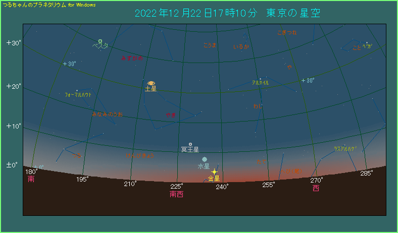 東京で日の入りから40分弱が経過した17時10分ごろ、南西の方角をご覧ください。まだ薄明が強く残る中、地平線ギリギリに明るい金星が見えます。水星は金星の左上へ5.2度離れたところにあります。高度は7.7度と低く、明るさは-0.5等です。明るさだけを見ると簡単に見つけられそうですが、薄明の中でしかも低空ですから、意外と難物です。