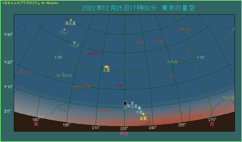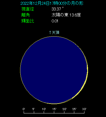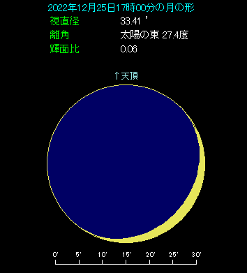 東京で17時ごろ、南西の地平線付近をご覧ください。この日、東京の日の入りは16時33分ですから、日没から30分ほどしか経っていません。地平線ギリギリ、高度1.0度のところに、沈みかけの月があります。超低空である上に月齢0.9という糸のように細い月ですから、肉眼ではまず無理です。双眼鏡を使ってもだいぶ怪しいところです。