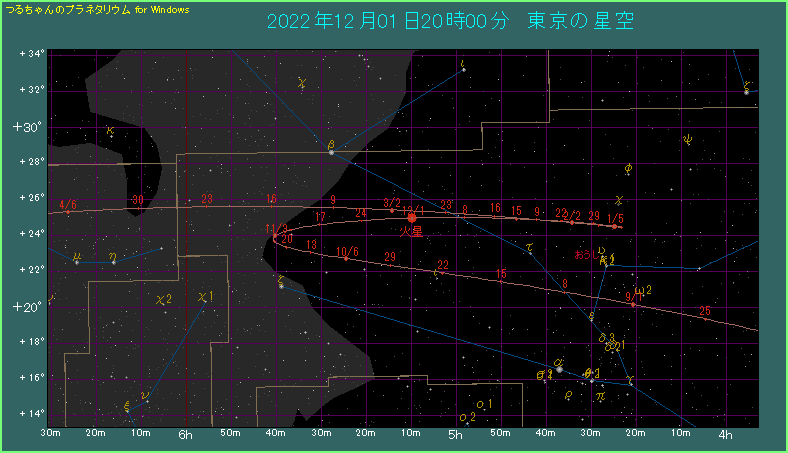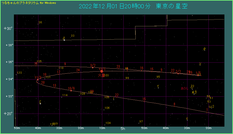火星の明るさの変化を見てみましょう。これまでなだらかに明るくなってきて、12月上旬に明るさがピークとなります。この頃の明るさは-1.9等に達します。その後は比較的早いペースで光度が落ちていき、2月上旬にマイナス等級でなくなってしまいます。