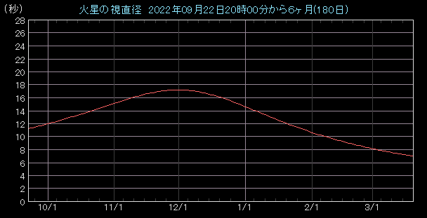 視直径(見かけの大きさ)のグラフを見てみましょう。火星の大きさは地球との距離によりますから、最接近となる12月1日がピークです。この頃の視直径は17.2秒に達しますので、小型の望遠鏡でも楽しめるでしょう。