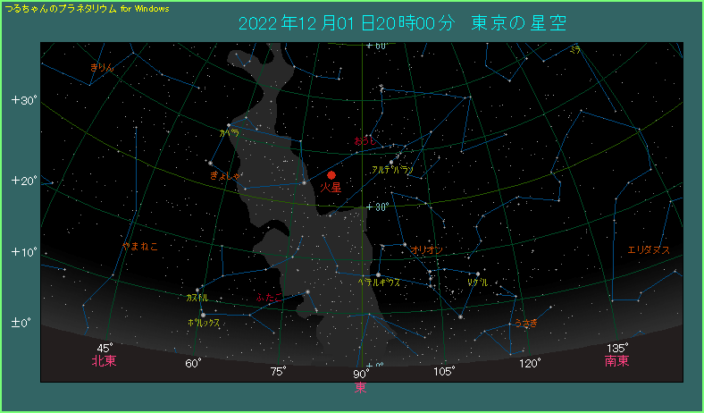 夜の20時ごろ東の空を見上げましょう。空の中ほどに見え、明るくて赤い星が火星です。左側に黄色の0等星カペラや、右側にオレンジ色をした1等星アルデバランがあります。しかし、火星の明るさは-1.9等ということで、ずっと明るい上に赤い色をしていますから、一目で火星とわかるでしょう。