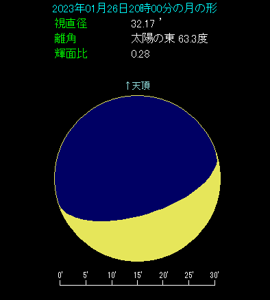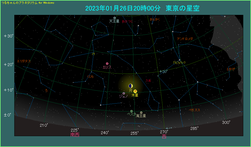 1月26日の夜、月と木星が斜めに並びます。 20時ごろ、西の方角をご覧ください。月齢4.6という三日月よりも少し太った月があります。月の右下へ3.9度離れたところに、金色に光る木星があります。先月よりも少し間隔が開きますが、まずまずの条件です。