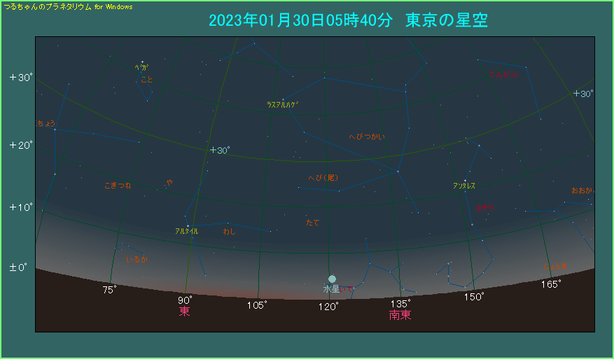 下の星図は東京で5時40分ごろ、南東の低空を見たようすです。日の出から1時間ほど前にあたり、25分前より薄明が始まっている時間帯です。高度は4.4度という低い位置にあります。明るさは-0.1等ありますので明るいように思いますが、実際は空が明るくなり始めているので油断できません。双眼鏡を準備された方が確実です。