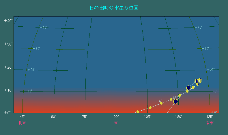 日の出時刻における水星の位置変化(5日間隔) |