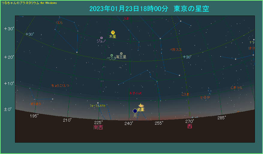 1月23日の夕方、金星と土星が0.6度まで近づく大接近となります。しかもこの日は、月齢1.5という非常に細い月が2惑星に近づきます。