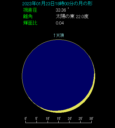 一番見づらいのが月です。輝面比が0.04と光る部分が非常に少ないですから、その光は弱くて頼りないものです。高度も4.9度しかありませんので、双眼鏡が必須と思われた方がよいでしょう。月と金星の間隔は4度ちょうどで、月と土星は4.1度です。金星と土星が1度を切る大接近しているところに月も加わった格好で、見ものです。