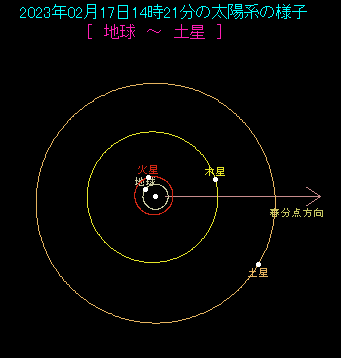 2月17日は土星が太陽と同じ方向にやってきて、合となります。 太陽系の図を見ると、地球・太陽・土星がこの順に一直線に並んでいます。地球から見た土星は太陽と同じ方向に見えることがわかりますね。