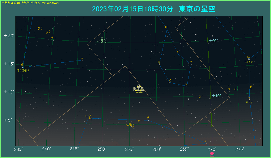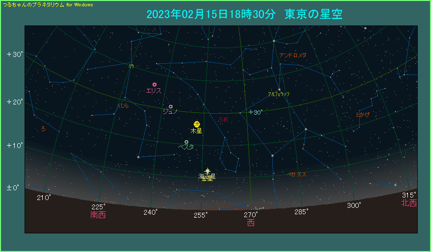 昨年に続いて2023年2月15日は、金星と海王星が0.1度を切る(?)超大接近となります。最も近づくのは22時前後で、「つるプラ」では2分角まで近づく表示になります。しかし残念ながら、この時間帯は地平線下ですので、実際は観測することができません。