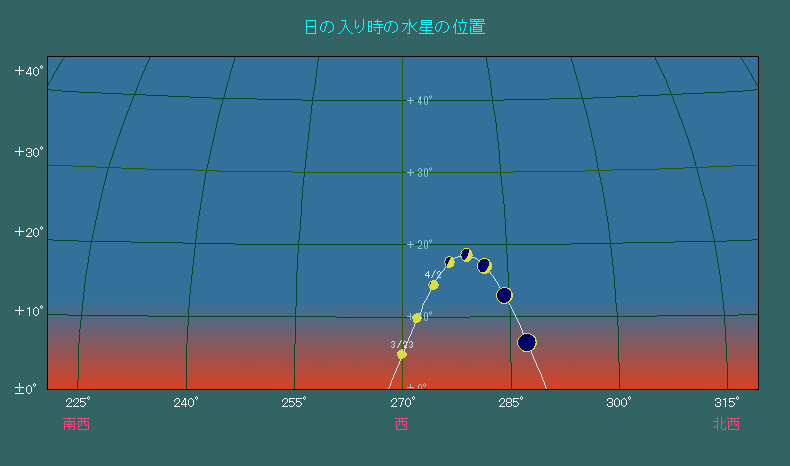 日の入り時刻における水星の位置変化(5日間隔) |