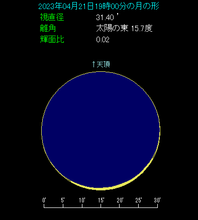 19時ごろ、西空の低空をご覧ください。高度が6度もない低い位置で、月と水星が2度ちょうどの間隔で横に並び、接近しています。といっても空が完全に暗くなるのは50分後ですから、まだまだ薄明中です。水星は2.1等しかありませんし、月の輝面比も0.02と2%しか光りません。どちらも肉眼で見つけられるか、だいぶ怪しいところです。双眼鏡が必要と思っておかれた方が良いでしょう。