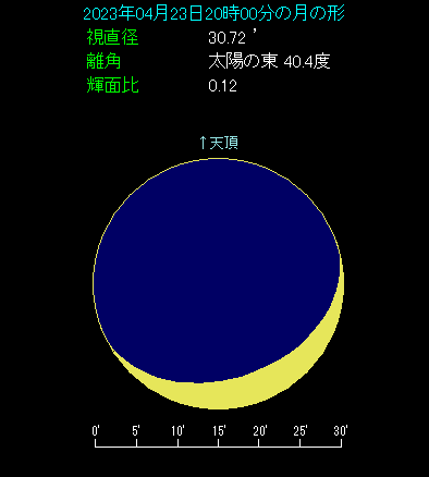4月23日は月と金星が接近します。 西空の比較的低い位置を見ると、月齢3.3の三日月と明るい金星が接近しています。この時間、東京では1.9度の間隔で斜めに並びます。1時間後の21時なら1.4度とさらに近づきますが、高度は7.7度と低くなってしまいます。