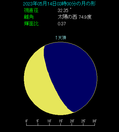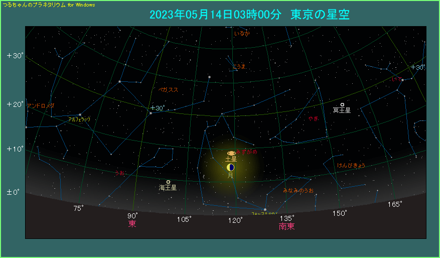 5月14日に月と土星が縦に並びます。 早朝3時頃、南東の方角をご覧ください。比較的低い位置に月が見えます。月齢23.6で、2日前が下弦です。月の上へ3.7度離れた位置に土星があります。土星は0.9等の明るさで、黄土色をしています。2月17日の合から3ヶ月が過ぎたことで、太陽から離れてすっかり見やすくなりました。
