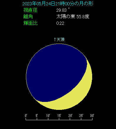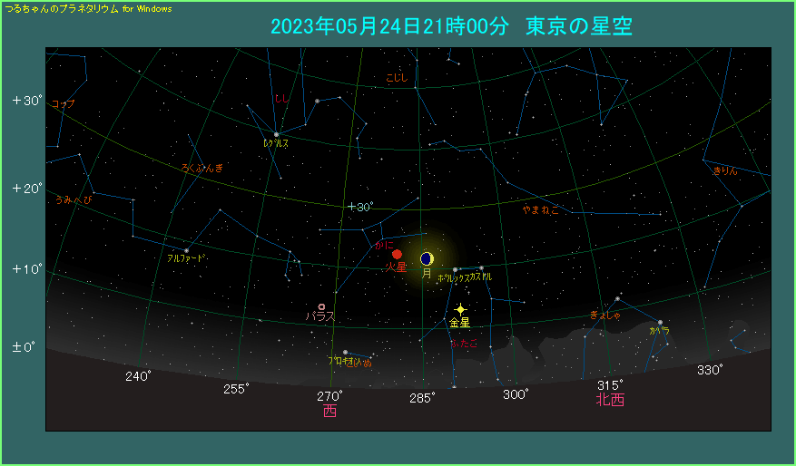21時ごろ西の方角を見ると月が見えます。三日月形をしていますが月齢4.8ということで、三日月よりも少し太っています。一方の火星は左側にあります。間隔は5.1度と少し開いています。火星の明るさは1.5等と、火星としては冴えません。