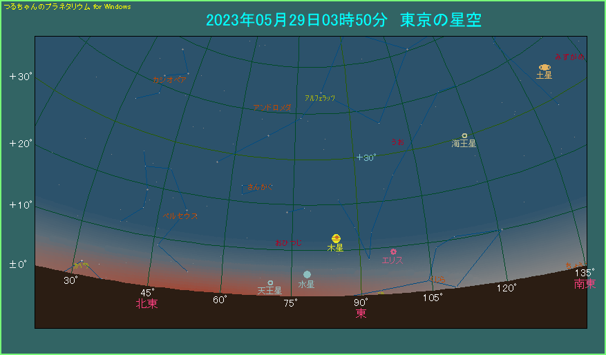 水星の右上に木星がありますので、まずこれを見つけしょう。双眼鏡を使って木星の左下方向、地平線近くを探します。時間がたつほど薄明が強くなるため、少し早い目の時間帯から探し始めましょう。この日、東京での水星の出は3時23分です。