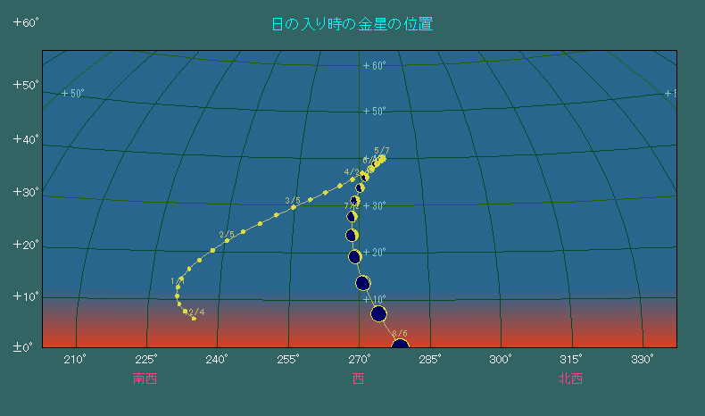 この後の金星は8月12日の内合を目指してドンドン高度を下げていきます。それとともに金星の大きさや形が大きく変化します。下の図は7日間隔でその変化を表したものです。たった一週間でも結構違いがあることがわかります。金星観測が一番楽しい時期ですから、天体望遠鏡をお持ちの方は、ぜひ観測してください。
