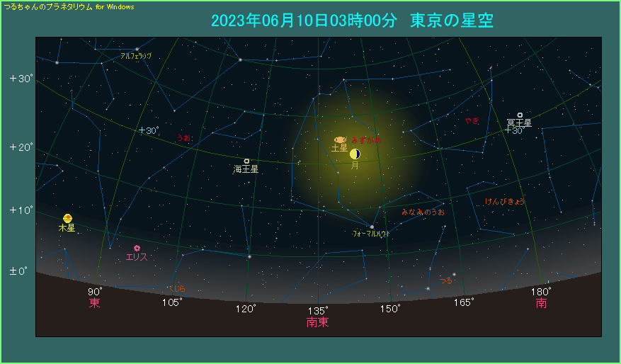 この時期は想像以上に早い時間から薄明が始まります。東京では2時37分から空が白み始めますので、星図の3時だと薄明開始から23分が経過しています。うかうかしているとドンドン空が明るくなりますから、注意しましょう。