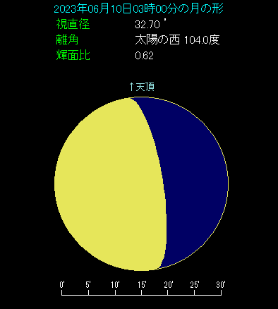 6月10日の早朝、月が土星に近づきます。 朝の3時ごろ、南東の方角をご覧ください。月齢21.1の月が見えます。明日が下弦ということで、半月よりもやや丸みを帯びています。土星は月の左上にあります。間隔は4.4度で、まずまずです。
