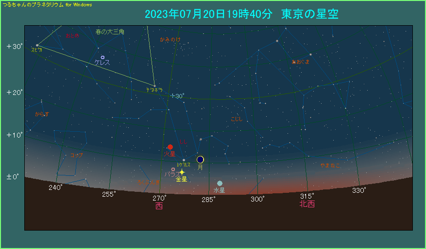 金星の左上、8.6度離れて火星があります。しかしここまで離れると、接近と呼べるものではありません。明るさも1.8等と冴えません。三天体の重心付近にしし座の一等星レグルスもあります。