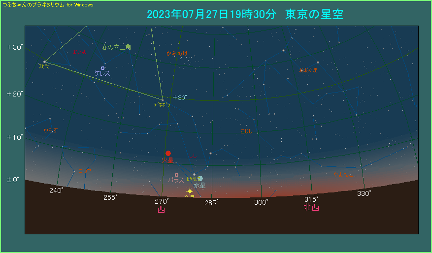 19時半ごろ、西の低空をご覧ください。地平線ギリギリに金星が見えます。高度は1.9度しかありませんので、今にも沈んでしまいそうです。一方の水星は金星の右上、5.1度離れたところにあります。高度は5.9度と金星ほどではありませんが、やはり低い位置です。明るさは-0.1等ですが、強い薄明中ですから、かなり見づらいでしょう。水星の左上へ2.3度離れたところに、一等星レグルスもあります。