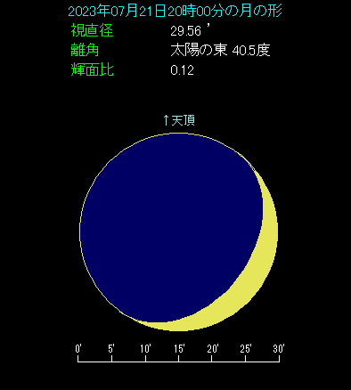 7月21日の夕方、月と火星が接近します。 20時ごろ、西の方角をご覧ください。月齢3.7の三日月よりもやや太った月があります。高度は12.6度と低い目です。火星は月の真下です。明るさは1.8等と2等星並の明るさです。月との間隔は2.6度ですから比較的狭い方です。