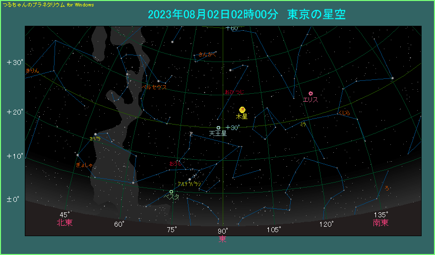 下の星図は夜中の2時ごろに、東方向を眺めた様子です。木星はおひつじ座にあり、空の中ほどで金色に輝きます。