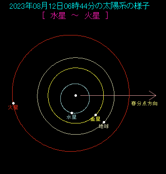 8月12日は金星が内合となります。 合とは惑星が太陽と同じ方向に見えることです。内惑星の場合、合は内合と外合の2種類あります。内合は太陽・金星・地球がこの順で一直線に並びます。太陽系の図を見るとおわかりいただけるでしょう。 もう一方の外合は、金星・太陽・地球の順で一直線に並びます。内合の場合は地球と金星が最も接近しますが、外合の場合は最も遠くなります。