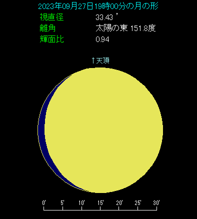 19時ごろに南東の空をご覧ください。月齢12.3で明後日が満月という大きな月が見えます。土星は月の右上にあり、5.6度離れています。土星は先月衝を迎えたところで、0.6等と明るくなっています。