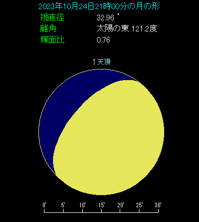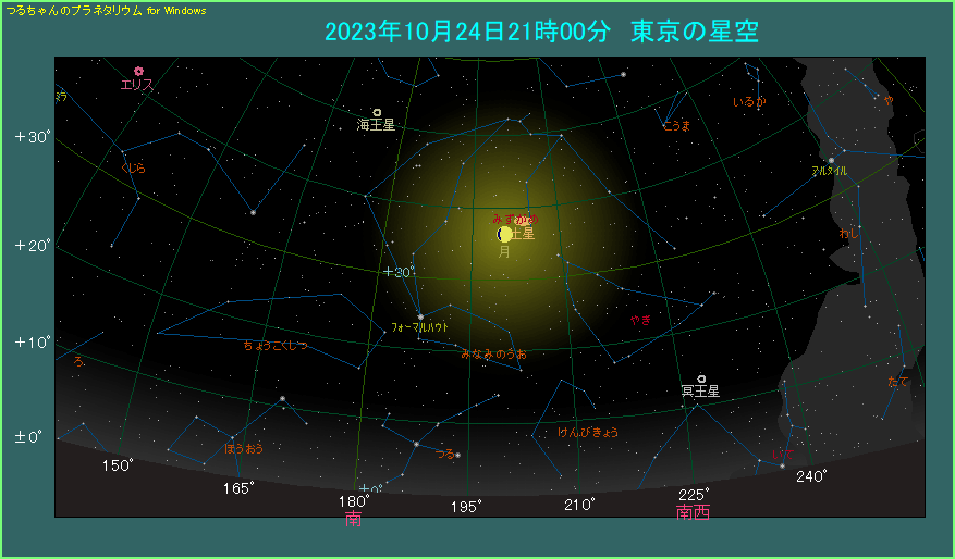 10月24日は月と土星が並びます。 21時ごろ、南からやや西よりをご覧ください。空の中ほどに丸みを帯びた月齢9.8の月があります。右上を見ると0.7等の土星があります。土星は落ち着いた黄土色をしています。間隔は3.2度ですから、条件的にはまずまず良い方です。