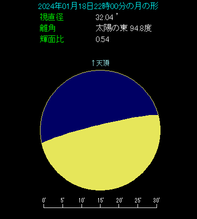 この後は時間がたつほど間隔が狭くなります。23時だと4.3度、翌日0時だと3.9度ですが、高度が下がってきます。東京での月の入りは0時36分ですので、日付が変わるころまでに見ておきたいところです。