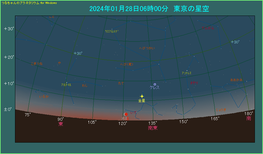 下の星図は朝の6時ごろ、南東方向を眺めたようすです。東京では空が明るくなり始めてから44分が経過しており、日の出までも44分しかありません。したがって、空はだいぶ明るくなっています。そんな中でまず目に止まるのは、低い位置で光る金星です。金星は-4.0等と明るいですから、まずこちらは見つけられるでしょう。