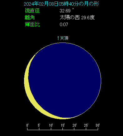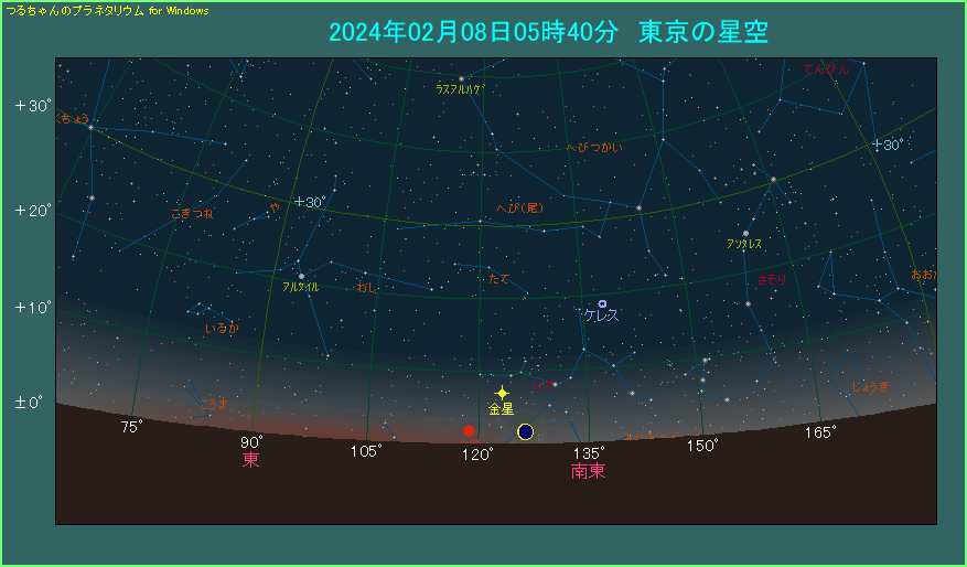 朝の5時40分ごろ、南東の低空をご覧ください。東京では日の出が6時36分ですから、日の出まで1時間を少し切った時間帯です。また、空が明るくなり始めたのはおよそ30分前で、薄明が進んでいます。