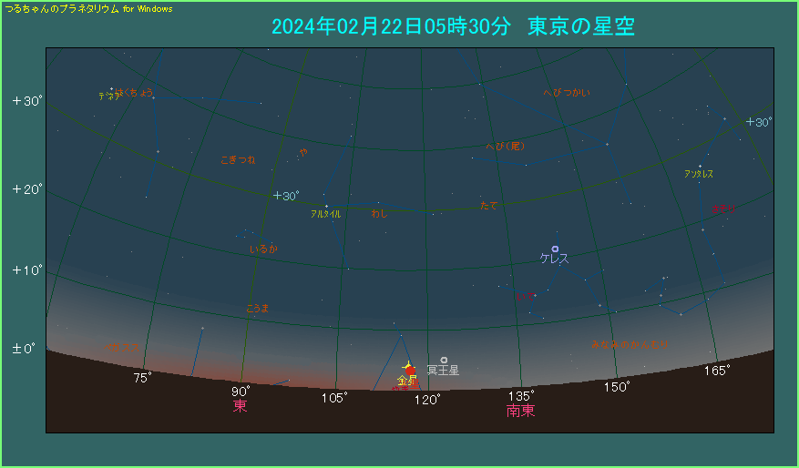 星図は東京で朝の5時半ごろ、東南東方向のようすです。低空に金星と火星が描かれています。金星の高度は3.9度、火星は3.3度しかありません。