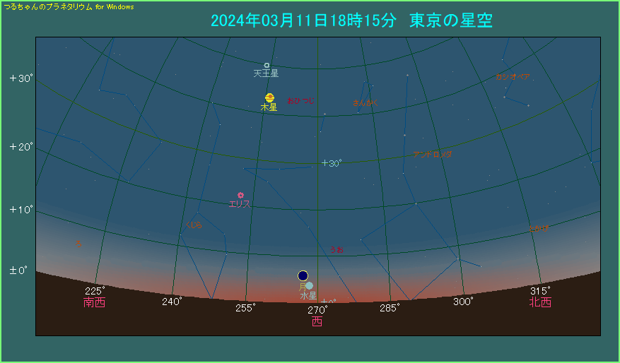 東京で18時15分ごろ、西の低空をご覧ください。月と水星が2.5度という比較的狭い間隔で、斜めに並んでいます。といっても月齢1.0の超がつく細い月です。輝面比は0.02で、ほとんど光る部分がありません。高度も5.9度しかない低空です。水星の高度はさらに低く、3.8度しかありません。明るさは-1.3等ですから明るいように思いますが、日の入りから30分しかたっていませんので空がまだ明るくて、見つけ出すのは簡単ではありません。