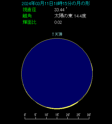 強い薄明の中で非常に細い月を見つけるのは至難の業です。肉眼で見つけるのは無理ですから、最低でも双眼鏡が必要と思っておきましょう。