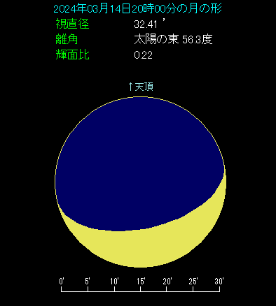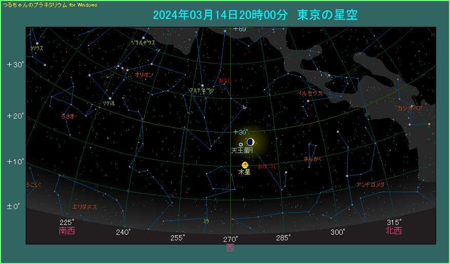 3月14日は月と木星が近づきます。 20時ごろ西の方角を眺めると、三日月よりも少しだけ太った月齢4.1の月が見えます。この時期の三日月は下側が光ります。木星は月の下側からやや左にあります。間隔は7度ちょうどで、だいぶ開いています。