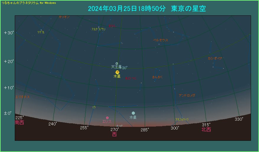 下の星図は18時50分ごろ、西の方角を眺めたようすです。53分前が日の入りで、空が完全に暗くなるのは33分後です。太陽高度は-11.5度ですから、まだ薄明が残りますが、そこそこ暗くなってきたかなといったところです。