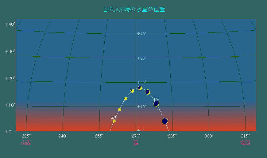日の入り時刻における水星の位置変化 |
