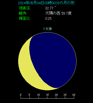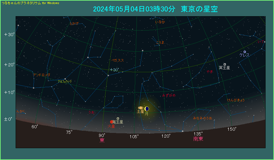 ゴールデンウィークの最中、5月4日に月と土星が接近します。 朝の3時半ごろ、東の方角をご覧ください。月齢25.0という新月から4日前の月が、低い位置にあります。土星はその左側にあり、1.1等で光ります。2.9度の間隔で横に並び、条件が良い接近となります。