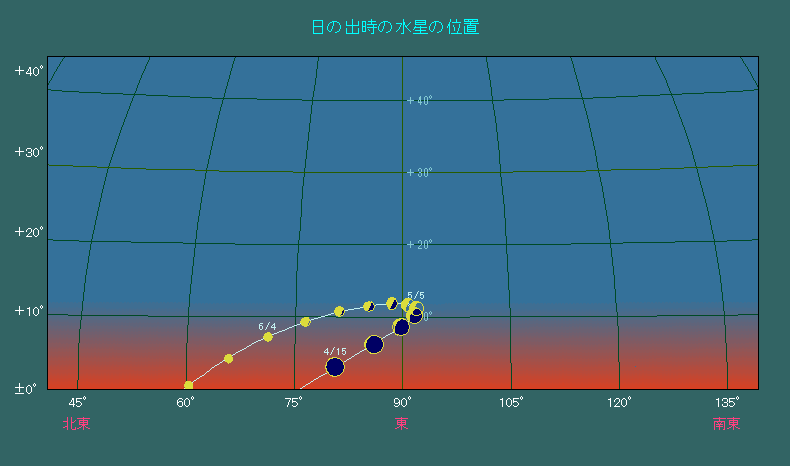 朝の4時ごろ、東の低空に水星が現れます。東京でこの時間帯は日の出が40分後に控えています。それにもかかわらず高度は3.6度しかありません。薄明が強い状態で0.5等の水星を肉眼で見つけるのは大変かもしれません。双眼鏡が必要と思っておかれた方が良いでしょう。