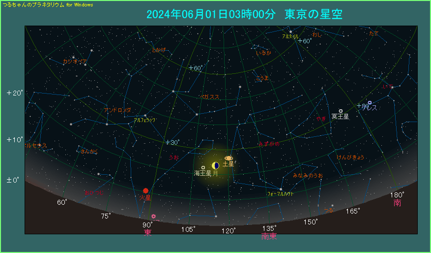 6月1日ということで6月の現象ではありますが、5月の天文現象が少ないので、一足早く記事を作りました。下の星図は朝の3時ごろに東南東を見た様子です。比較的低い位置に月齢23.6の月があります。昨日が下弦でしたから、半月よりも少しだけ欠けています。月の右からやや上側に土星があり、6.1度離れています。今回は間隔が広い目ですが、次回は良い条件の接近が見られます。