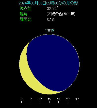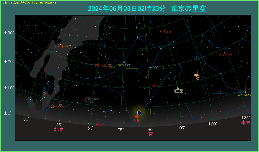 2時30分といえば深夜に思えますが、意外なことに東京では2時40分から空が明るくなり始めます。薄明開始がすぐそこまで迫っていますので、早い目にご覧ください。