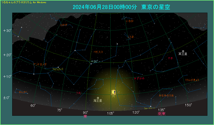 6月27日から28日にかけての夜、月と土星が大接近します。 下の星図は28日0時ごろ、真東よりも少し南側を眺めたようすです。月齢21.1という、二日後が下弦となる丸みを帯びた月があります。0.9等の土星は月の上側、0.9度離れたところにあります。1度を切る大接近ですから、見ごたえがあるでしょう。