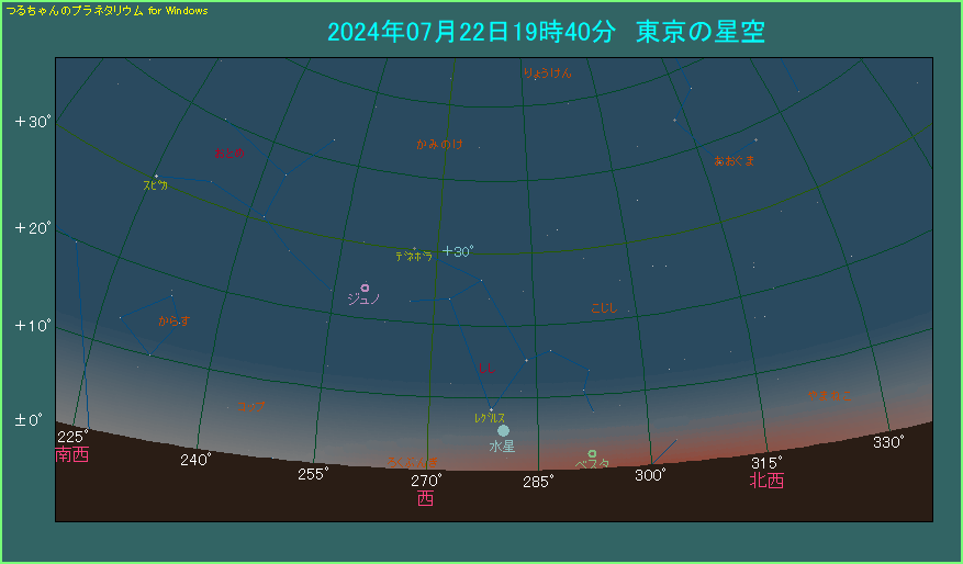 2024年は東方最大離角が3回ありますが、今回はその中で2番目に条件が良いものです。19時40分ごろ西の低空に水星があります。明るさは0.5等ですが、日の入りから47分しか経っておらず、空が完全に暗くなるのにあと55分あります。水星を肉眼で見つけるのは、空の条件次第では難しいかもしれません。双眼鏡を使用されることをおすすめします。