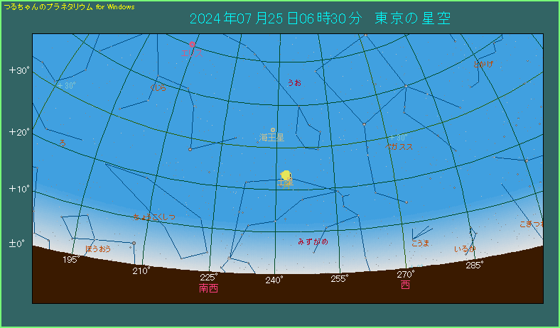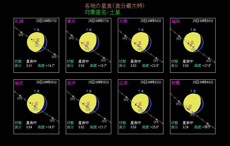 土星食は全国的に見られます。多くの地点で大体6時20分台に潜入となり、東京では6時29分頃です。この日、東京での日の出は4時44分ですので、日が昇ってからだいぶ時間がたっています。