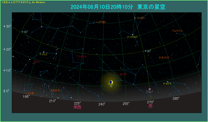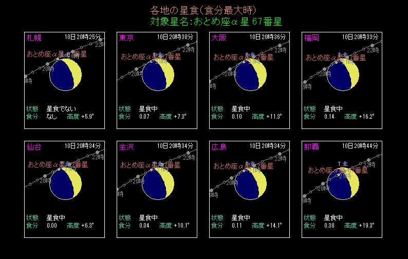 スピカ食が見られるのは東北南部よりも南の地域です。仙台市や山形市では食になりますが、秋田市や盛岡市では食にならず、ニアミスで終わってしまいます。逆に食になる地域でも、月の縁をかすめる程度の箇所がほとんどです。月齢は6.0で月の暗部へ潜入し、明部から出現します。