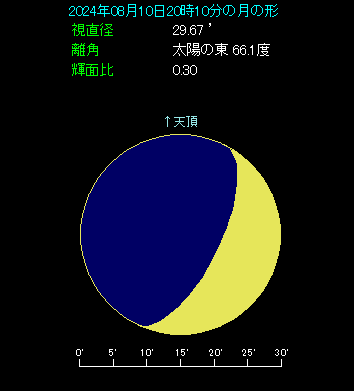 出現は20時30分台から50分台までまちまちですが、50分台の地点が多くなっています。東京の出現は20時51分ごろです。月の高度は5度を切っており、地平線付近まで開けた場所から観測する必要があります。福岡の出現は20時52分ごろですが、高度は13度あって少し余裕があります。