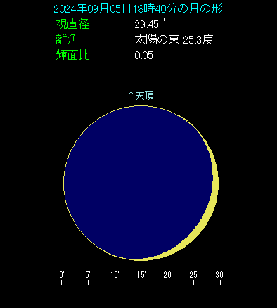 月は金星のすぐ下ですが、月齢2.3で輝面比は0.05しかありません。視直径の20分の1しか光りませんので、月の光は弱々しいものです。高度も3.5度しかないことを考えると、肉眼で見るのは骨が折れるかもしれません。双眼鏡を使ってご覧ください。