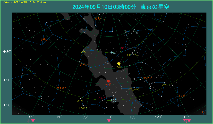 木星は5月19日に太陽と同じ方向へやってきて、合となりました。その後は少しずつ太陽から離れ、9月10日は西矩となります。西矩とは、惑星が太陽の西側へ90度離れることで、そろそろ惑星の観測条件が良くなってくる一つのサインです。