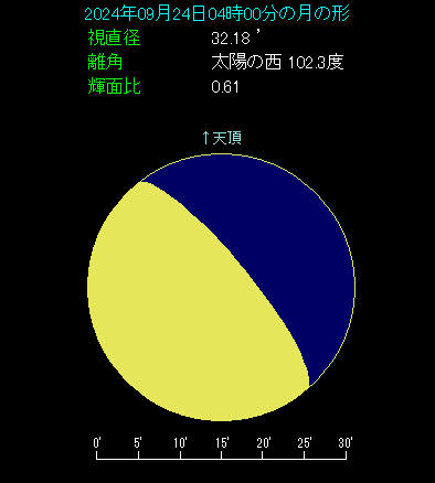 朝の4時ごろ、南東を向いて天高くを見上げると、月齢20.7の月があります。明日が下弦ですから、半月よりも少しだけ丸みを帯びています。木星はその右下にあり、5.9度離れています。間隔が開いていますので、接近の条件としてはあまり良くありません。