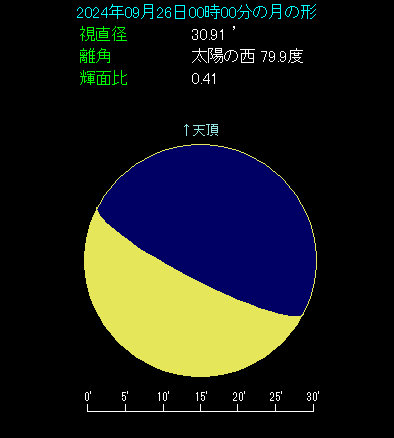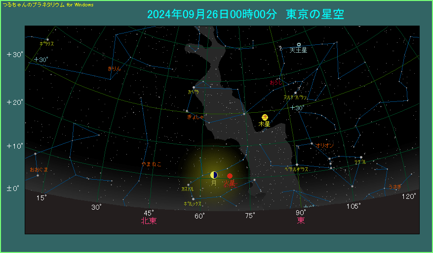 9月26日は月と火星が横に並びます。 25日から26日にちょうど日付が変わった頃、東北東の低い位置をご覧ください。下弦を1日過ぎた半月状の月が見えます。月の右側へ少し離れて0.5等で赤く光る星があり、これが火星です。両天体の間隔は4.9度で、真横に並んだ格好です。